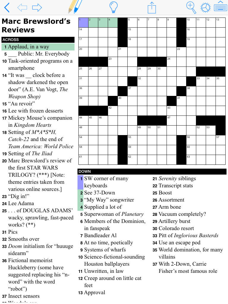 This book contains the first half of a 50-puzzle collection of science fiction crosswords by T Campbell.