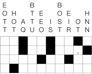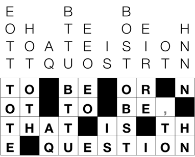 A drop quote puzzle consists of two parts — a grid of squares and a set of given letters which “drop” into the grid. When the puzzle is solved, the grid will be filled in with a quotation or other statement. Within the grid, blocks represent the spaces between words, and punctuation, if present, will already be placed. Each line in the grid is filled completely, so a word may be broken between lines, starting at the end of one line and continuing to the beginning of the next line — words only end at blocks or the end of the puzzle. The given letters at the top of a drop quote puzzle are organized by the column they “drop” into, and are given in alphabetical order. Use your knowledge of the language and process of elimination to figure out where each letter goes.