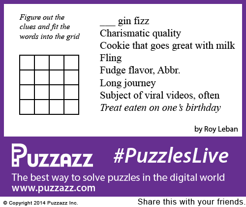 Our Puzzle Books Buy Gift Certificates Our World-Class Authors How to Solve Puzzles Our exclusive, award-winning TouchWrite™ handwriting recognition Special features: Puzzles Live 2013 100th Anniversary of the Crossword Get the puzzle of the day: Read the latest Puzzazz Newsletter About Us Contact Us Support FAQ Read the Buzz about Puzzazz Your account Redeem a coupon or special offer Cookies: If you sign in, we use a cookie for that purpose. We also use cookies to manage your browser session. If you use third-party services, such as Facebook, with Puzzazz, they may use cookies following their own policies. © 2025 Puzzazz Privacy Policy |